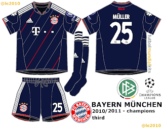 El F. C. Bayern München (GER) participa de la UEFA Champions League 2010/2011. Lo hace en el grupo E junto con A. S. Roma (ITA), CFR Cluj (ROM) y F. C. Basel 1893 (CHE). Viste remera "adidas" a bastones rojos y blancos con el logo de "T mobile" en el pecho. La espalda y los hombros son rojos. El short es rojo con las tres tiras blancas y las medias son rojas con las tres tiras negras.